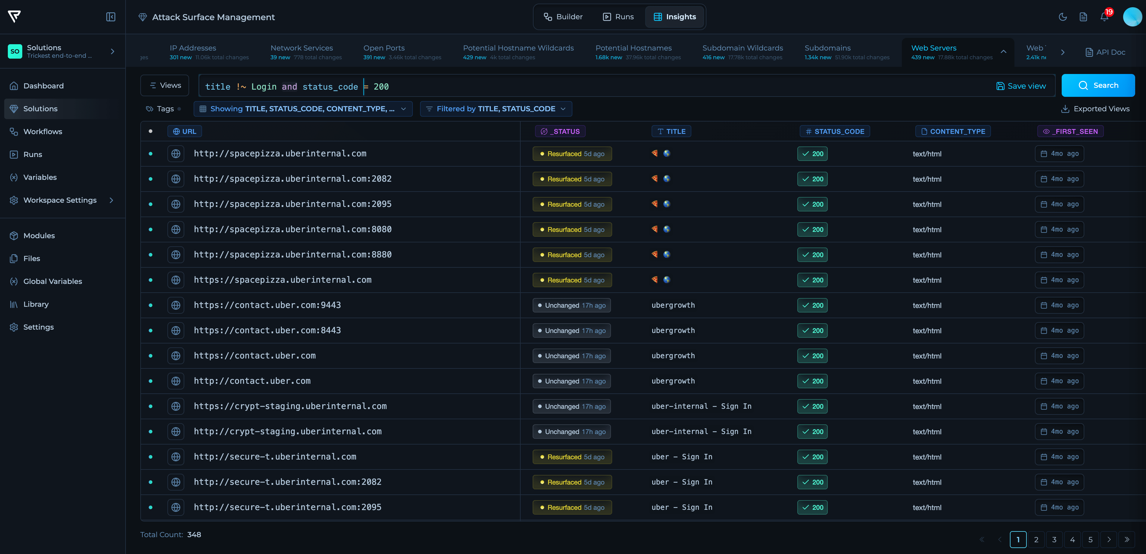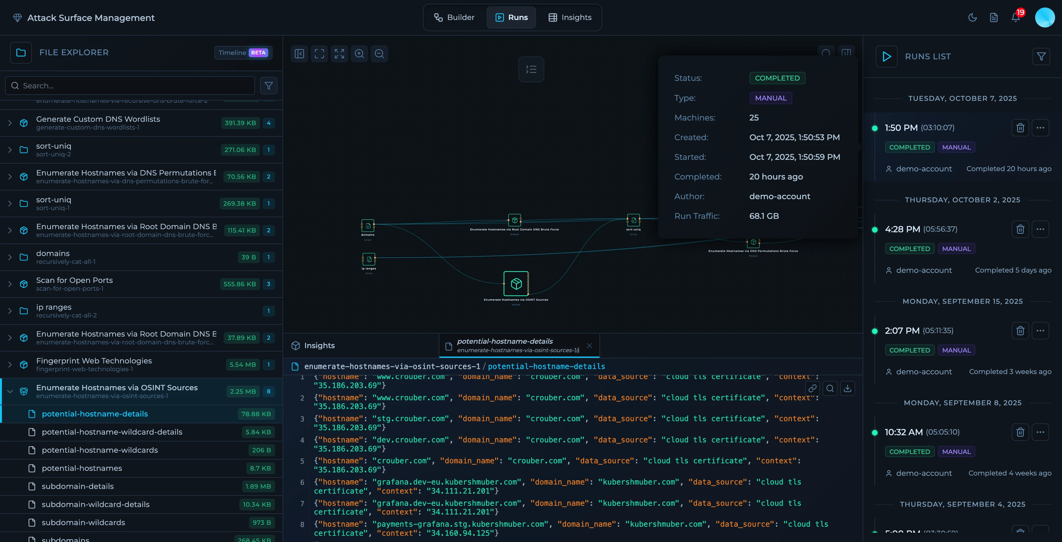 Explore the results generated by the workflow. View consolidated assets, changes over time (new, removed, resurfaced), technology fingerprints, open ports and services, and web exposure. Insights provides deltas, trends, and context to help prioritize follow‑up actions and integrate with downstream systems.