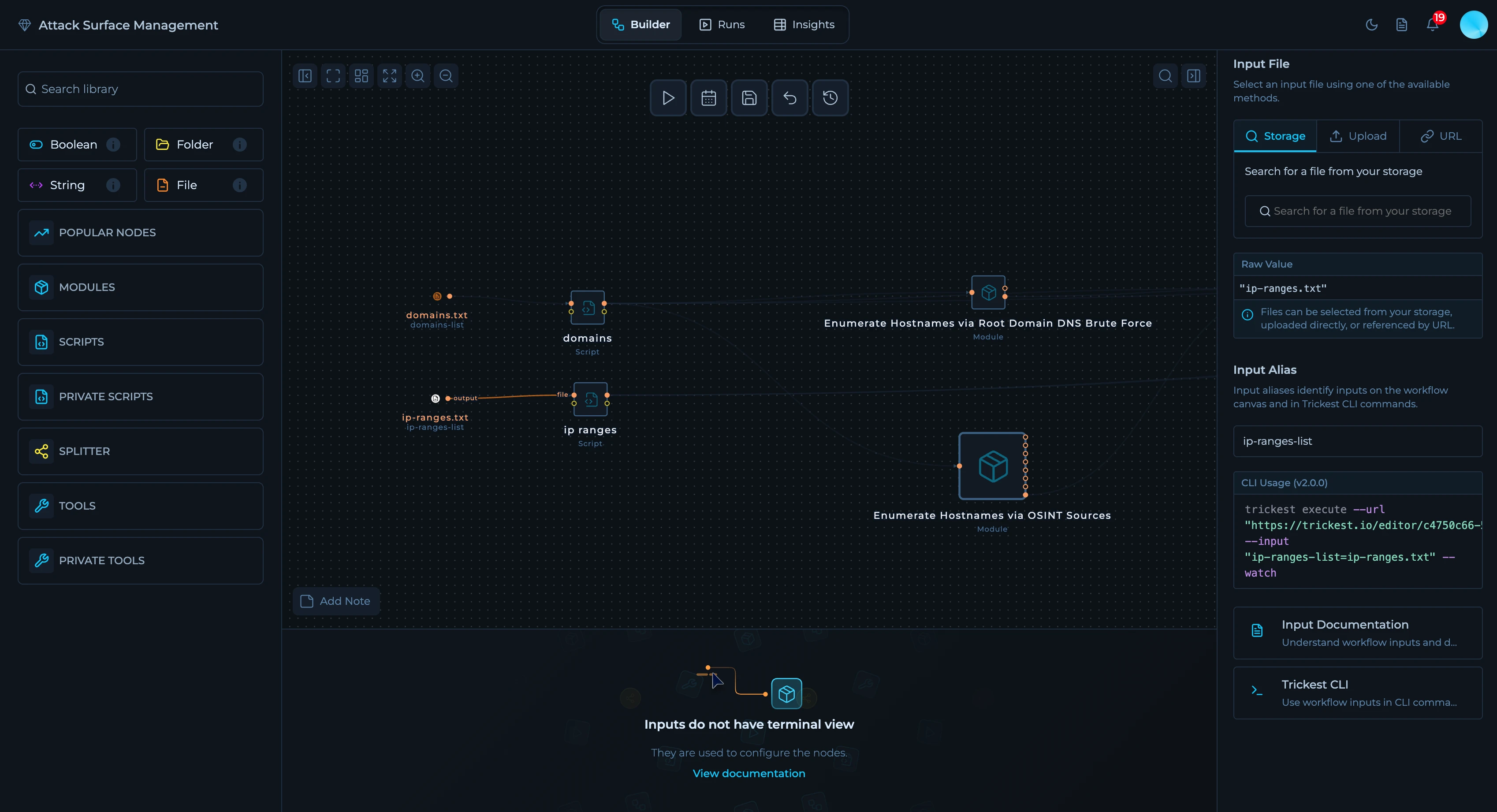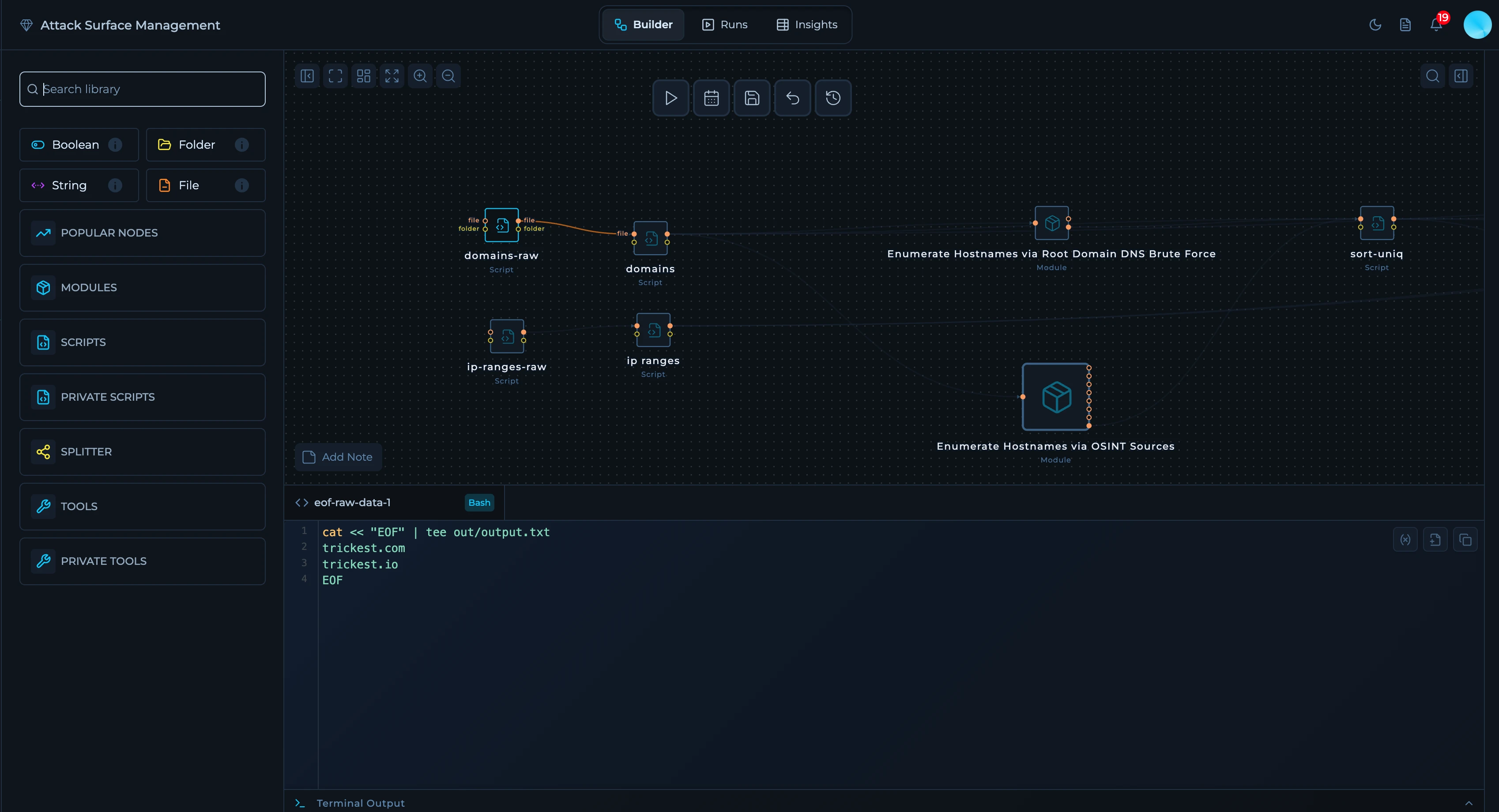 Design and customize the ASM workflow. This view shows the prebuilt ASM workflow graph and lets you tailor modules (for example, Seeding, Discovery, Enrichment) and parameters to your environment, add open‑source or in‑house tools, and define inputs and outputs. The Builder is where you configure the exact workflow used for ASM.Modules used in the ASM Workflow