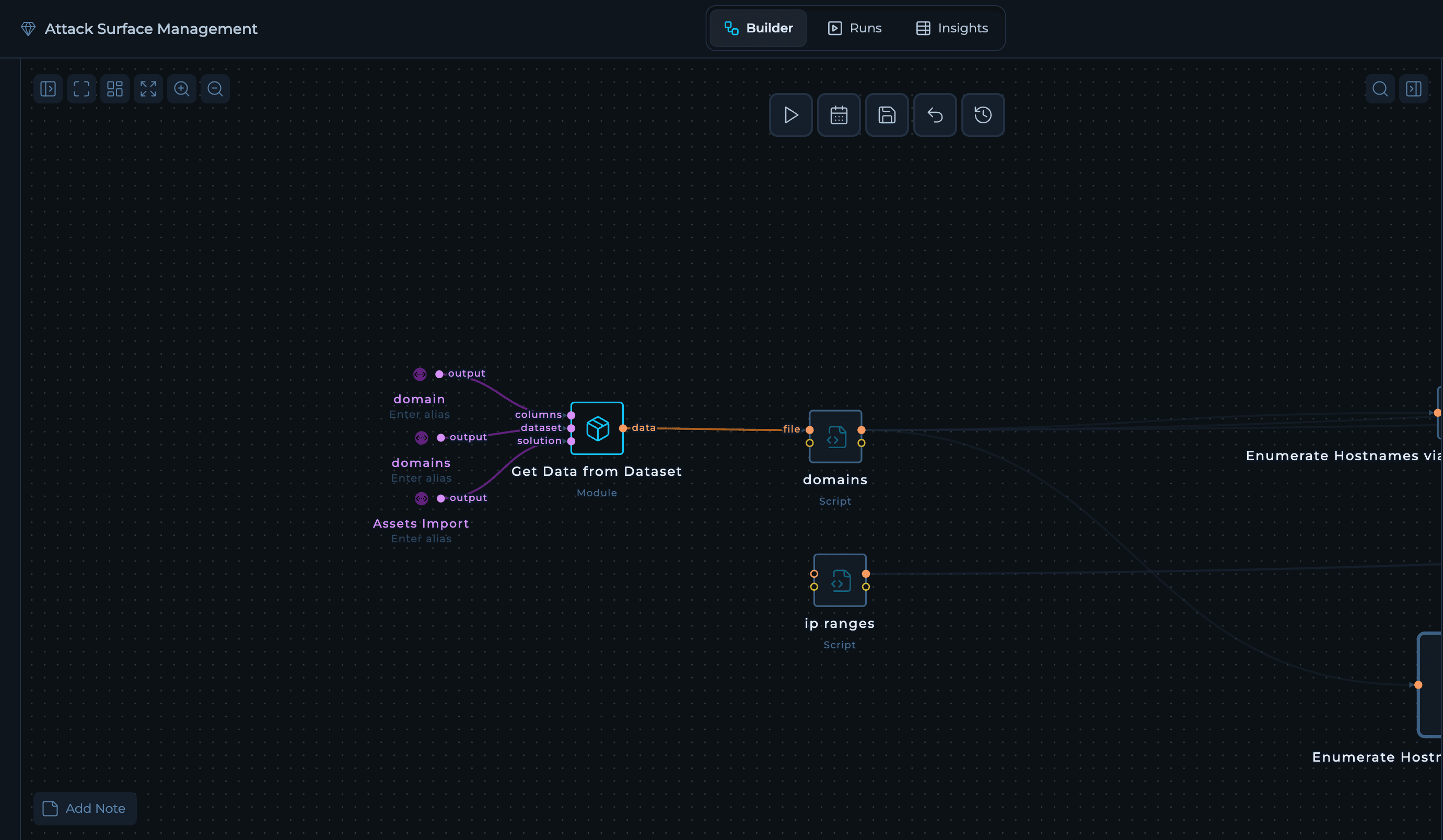 Use the Get Data from Dataset module to pull your domains and IP ranges from an existing dataset and feed them straight into the ASM workflow. Think of it as “selecting” the right column from your source of truth and sending it forward — no manual files needed.If you already maintain a solution dataset with assets, this is the easiest way to keep ASM in sync. When the dataset updates, your next run picks up the changes automatically.