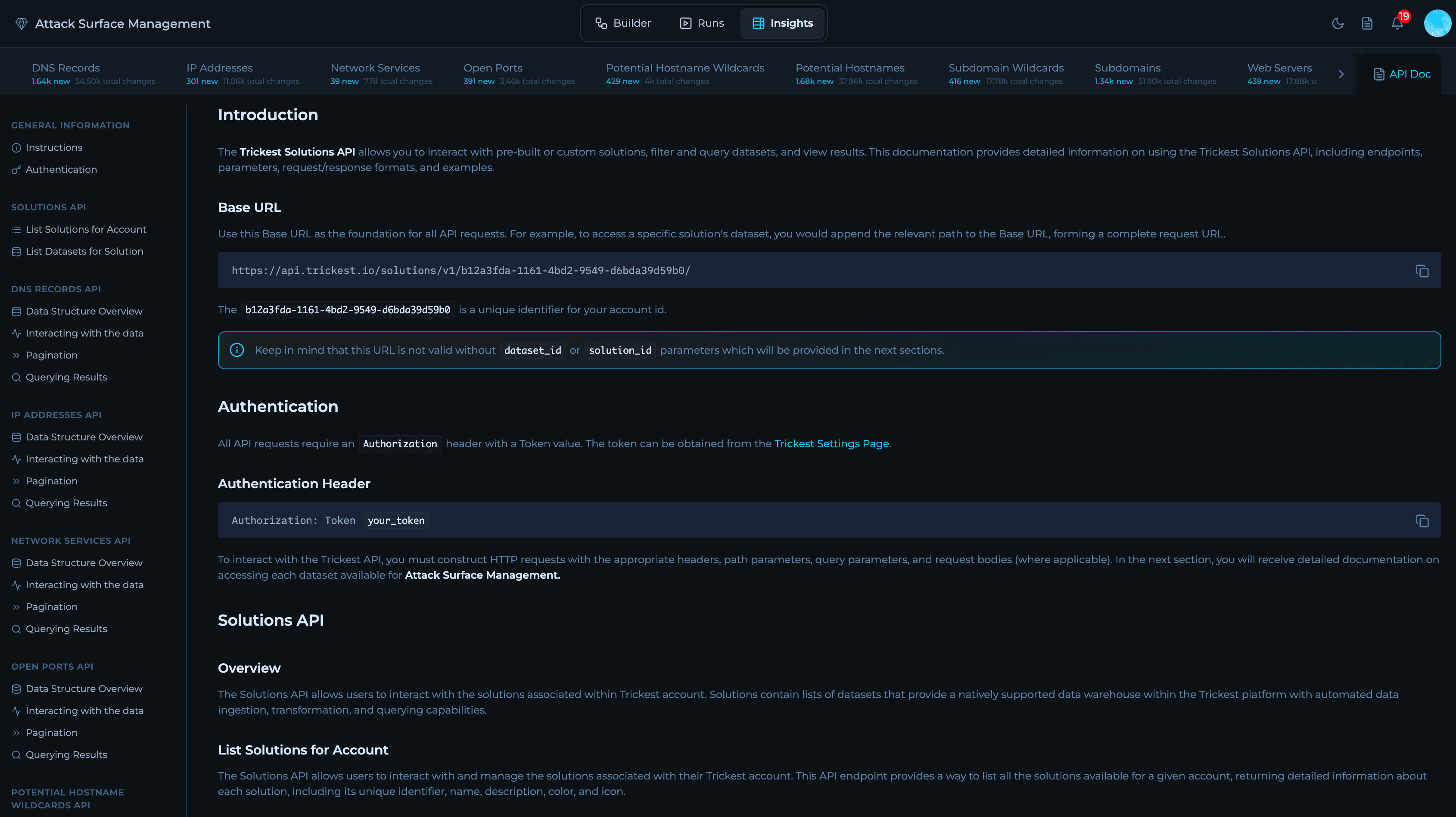 You can access Solutions API programmatically to list solutions, browse datasets, and fetch results. Most users don’t need to memorize endpoints—when you open any Solution in Trickest, you’ll find an “API Docs” panel with ready‑to‑use snippets (curl, Python, JavaScript) tailored to your workspace and the selected dataset.Where to find it: Open a Solution → Click on