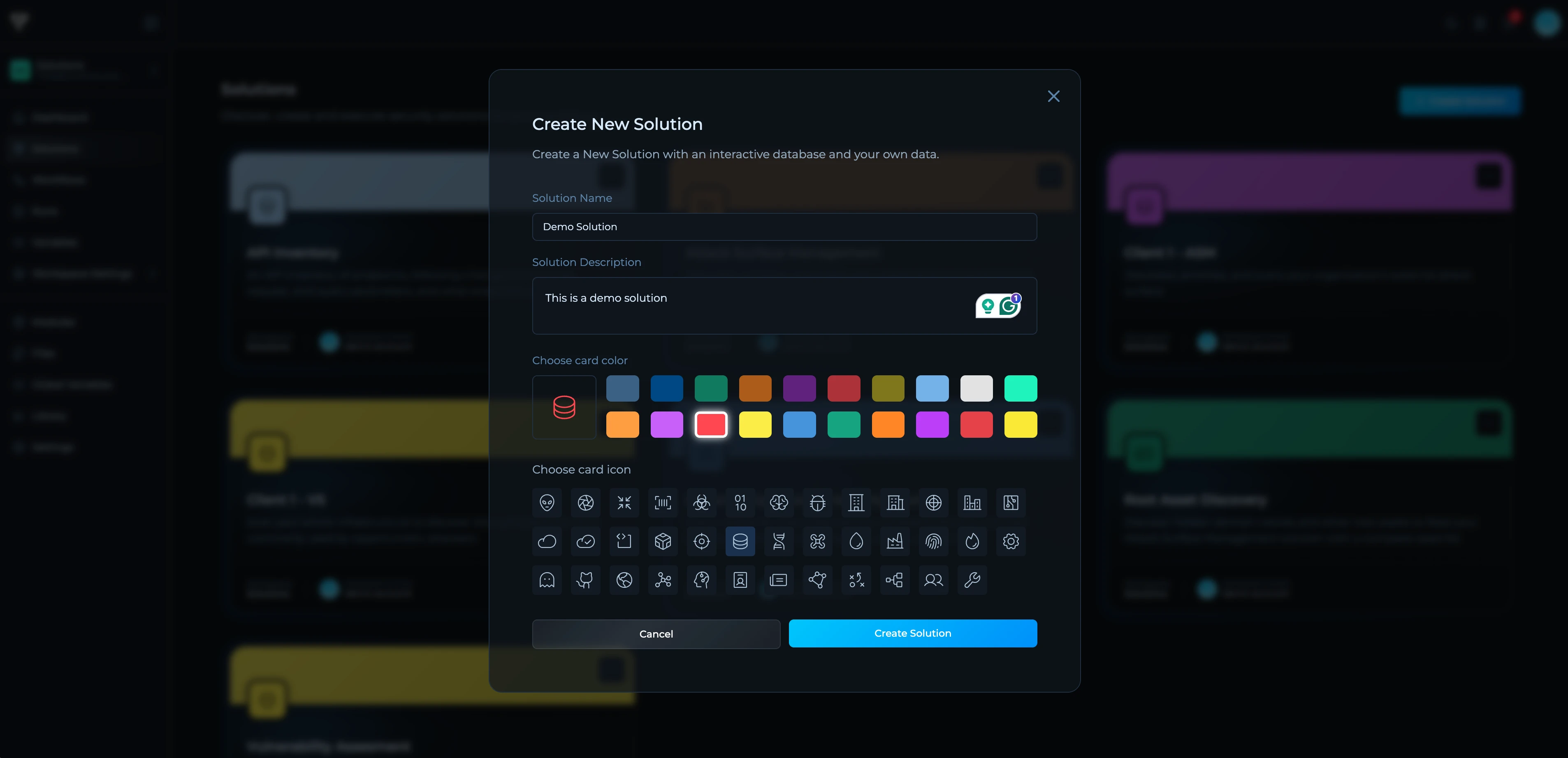 Card Color: Select a color to make your solution visually distinct on the dashboard. Use consistent colors for related solutions.Icon: Choose an icon that represents your solution’s function. Available icons include security, network, cloud, database, and monitoring symbols.