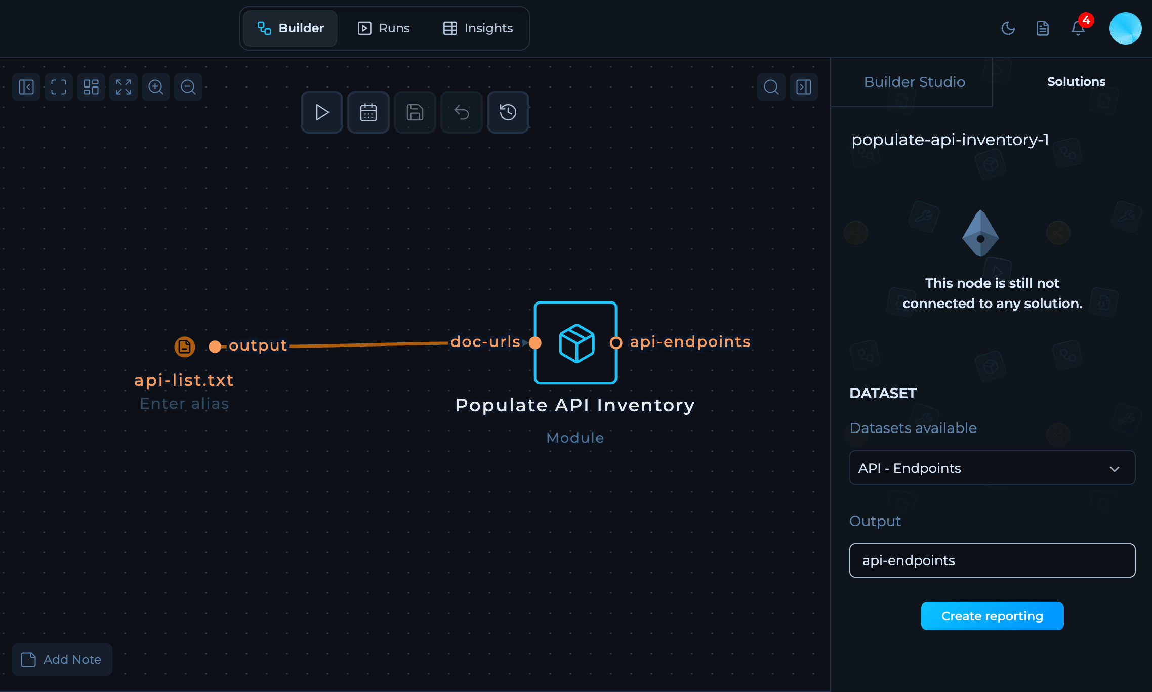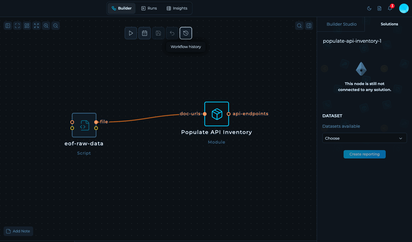 Switch to the Builder tab to design your solution’s workflow. Here you’ll combine tools, modules, and scripts to process your inputs and generate the outputs that feed into your dataset.Workflow Components