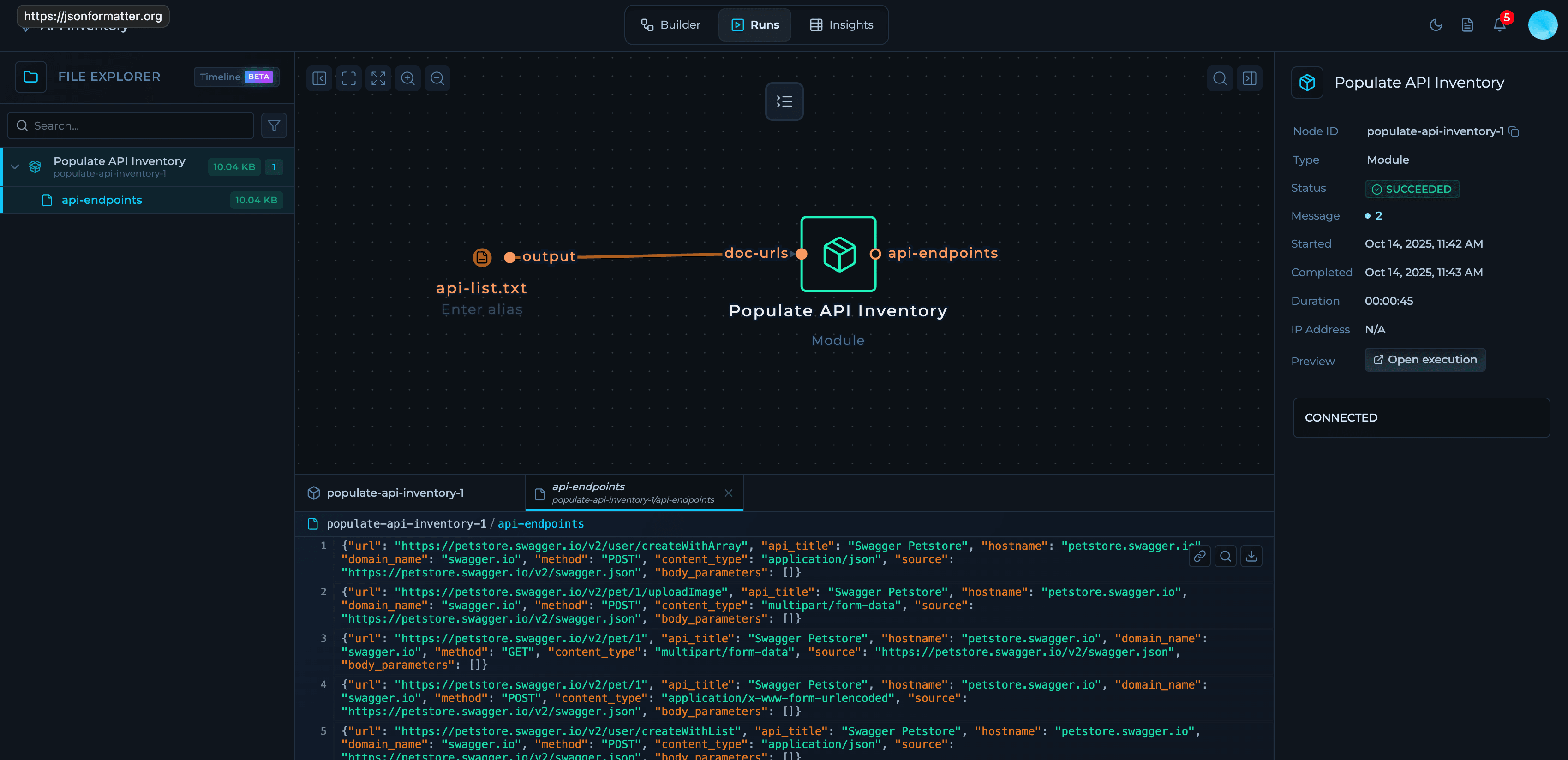 ) - Processing: Use the custom module to extract API endpoints and structure the data into a JSON format.