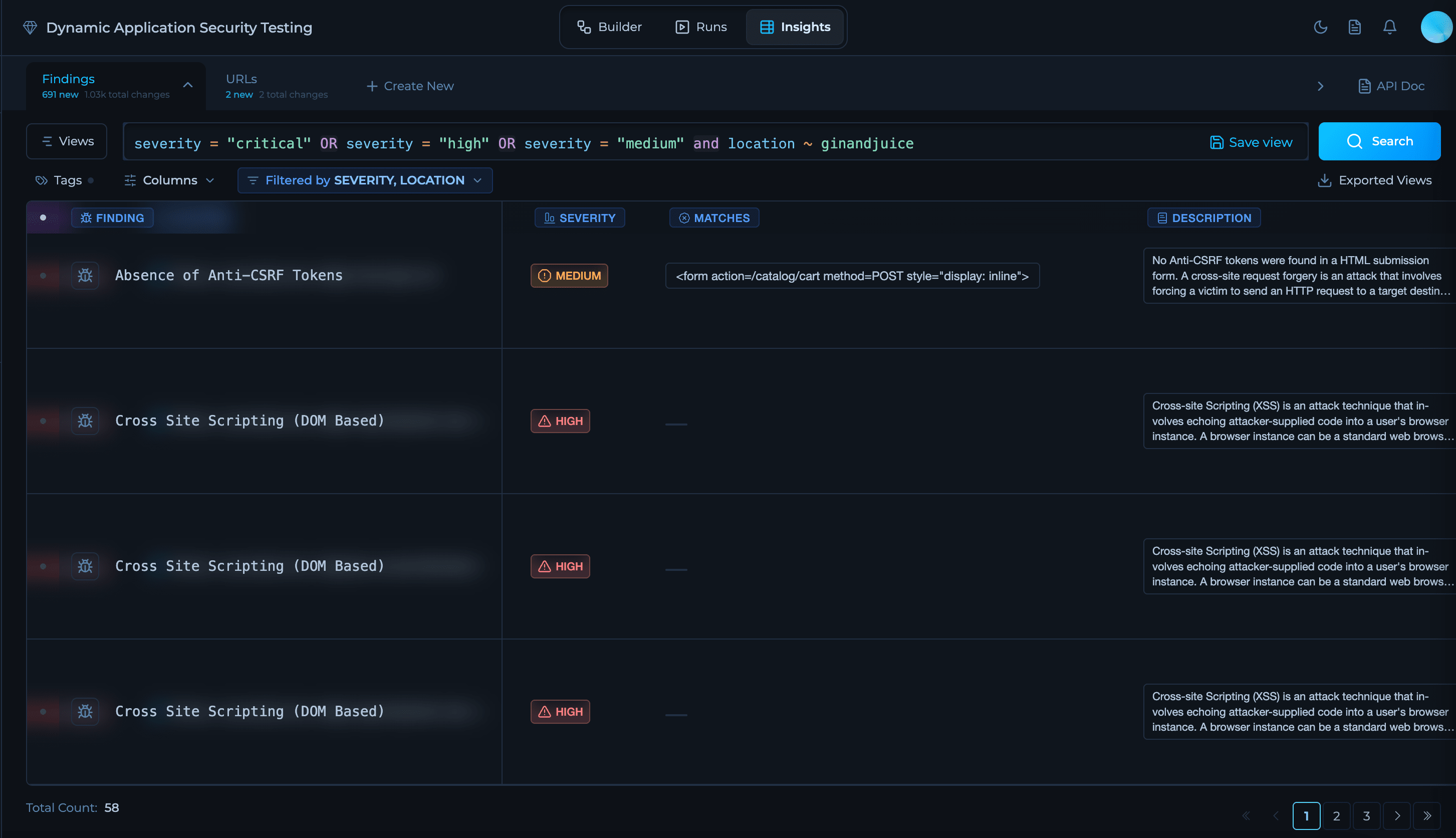 Explore the results generated by the workflow. View consolidated vulnerabilities, changes over time (new, missing, removed, resurfaced), technology fingerprints, exposed endpoints, and security issues. Insights provides deltas, trends, and context to help prioritize remediation actions and integrate with downstream systems.