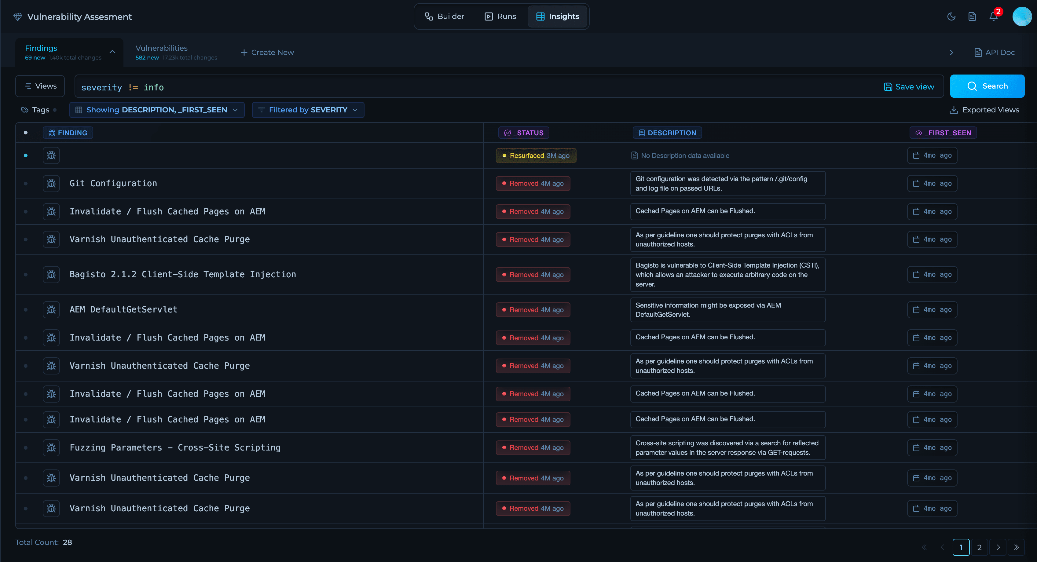 Explore the results generated by the workflow. View consolidated vulnerabilities, changes over time (new, fixed, resurfaced), severity distribution, affected assets, and compliance posture. Insights provides deltas, trends, and context to help prioritize remediation actions and integrate with downstream systems.