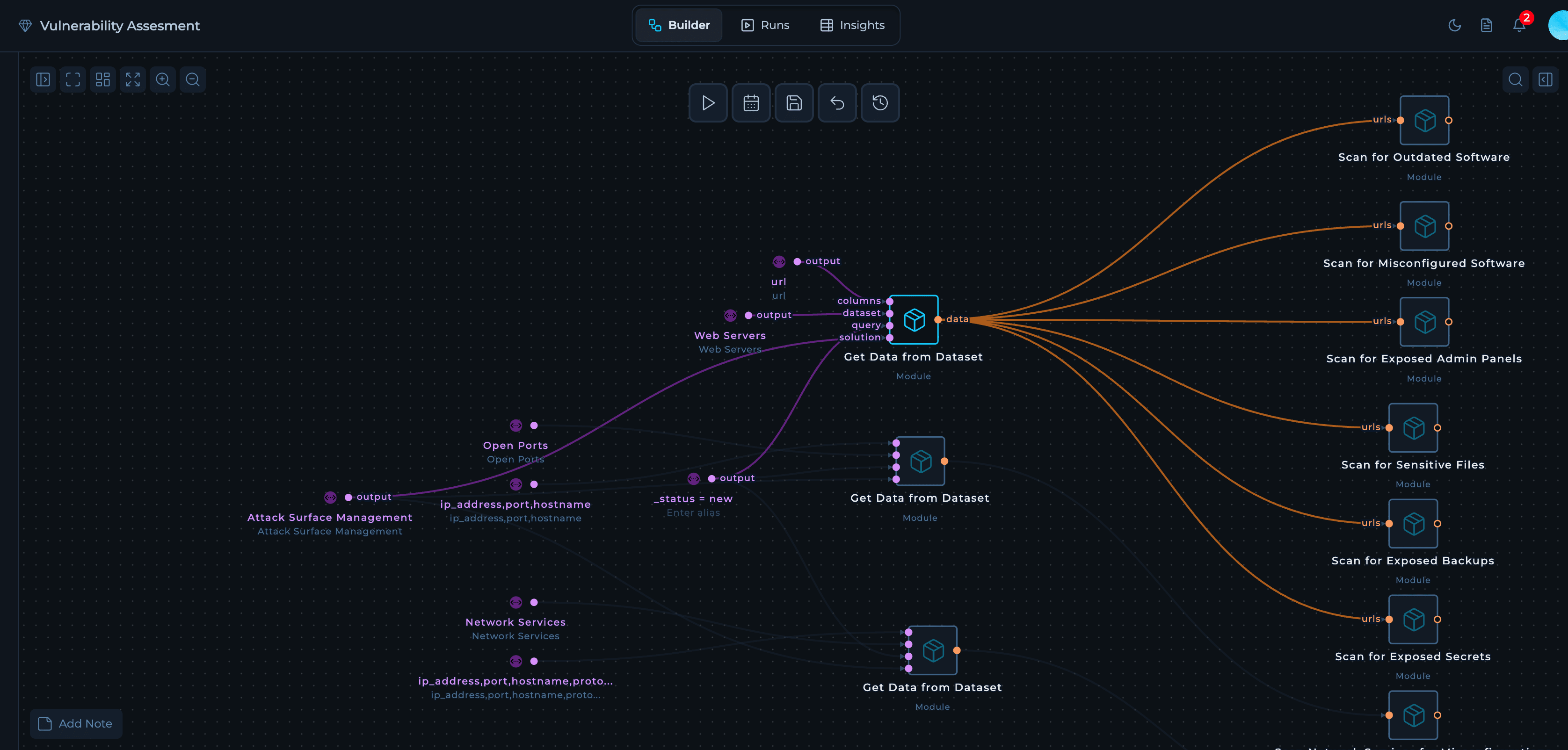 - Get Data from Dataset: Pulls new assets from Attack Surface Management datasets (Web Servers, Open Ports, Network Services) for continuous vulnerability assessment.