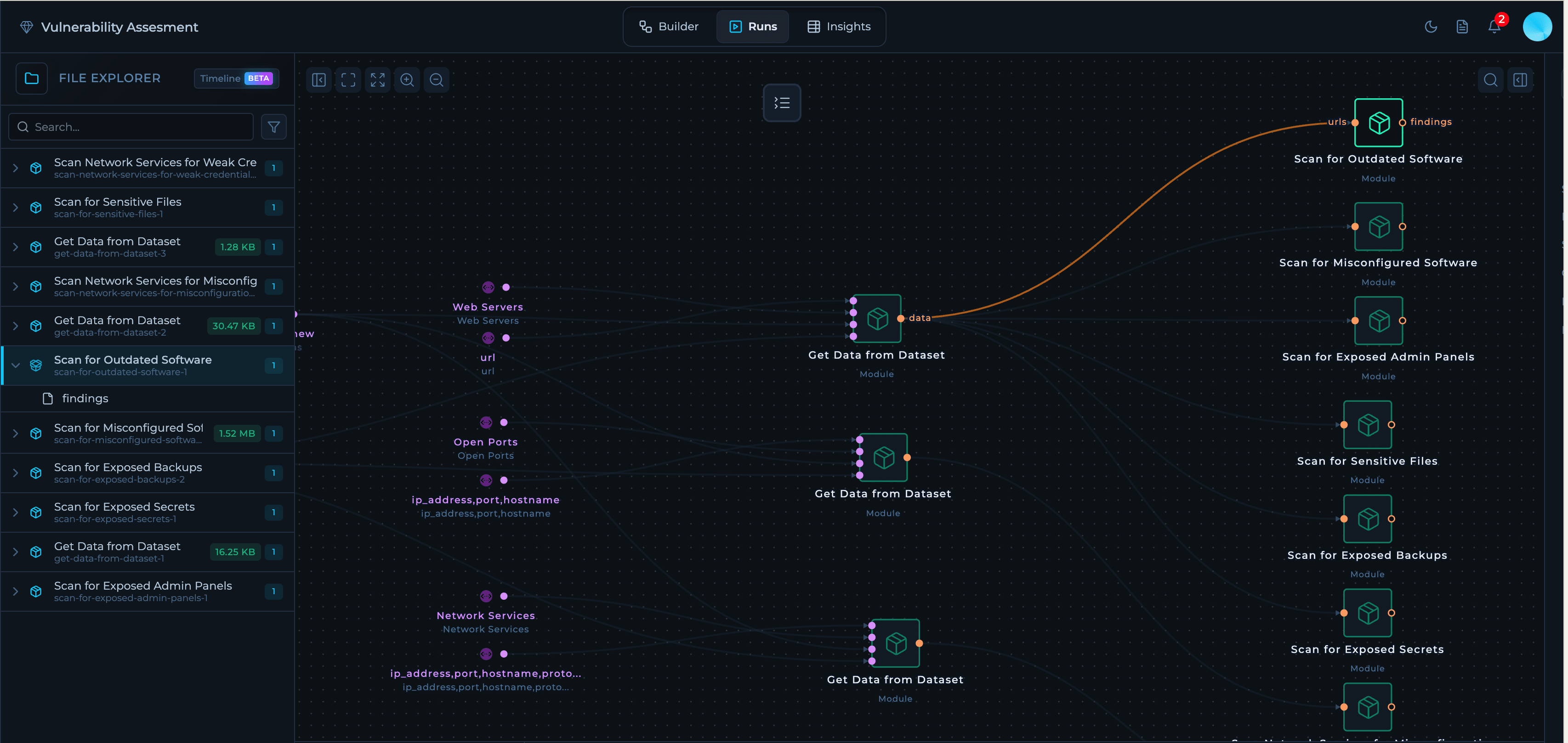 The Vulnerability Assessment solution is designed to continuously scan new assets discovered by Attack Surface Management for vulnerabilities. The workflow automatically queries ASM datasets for newly discovered assets and feeds them into vulnerability scanning modules.How It Works